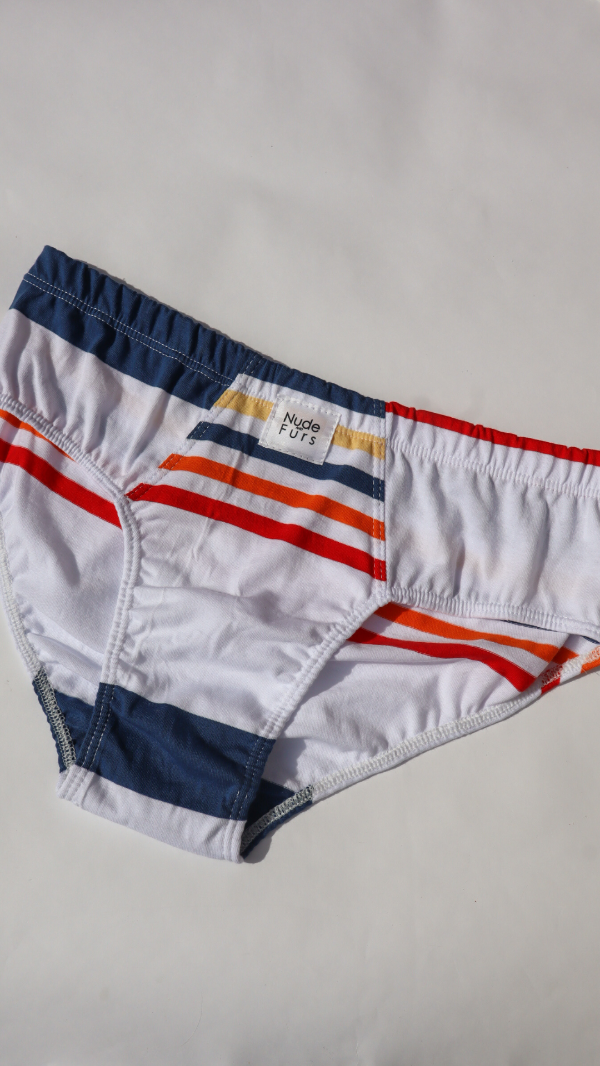 Una pieza que celebra el color y la armonía. El Slip PRIMARIO combina líneas en rojo, azul y amarillo sobre fondo blanco, logrando un diseño vibrante y equilibrado que reinterpreta lo clásico con un toque contemporáneo.